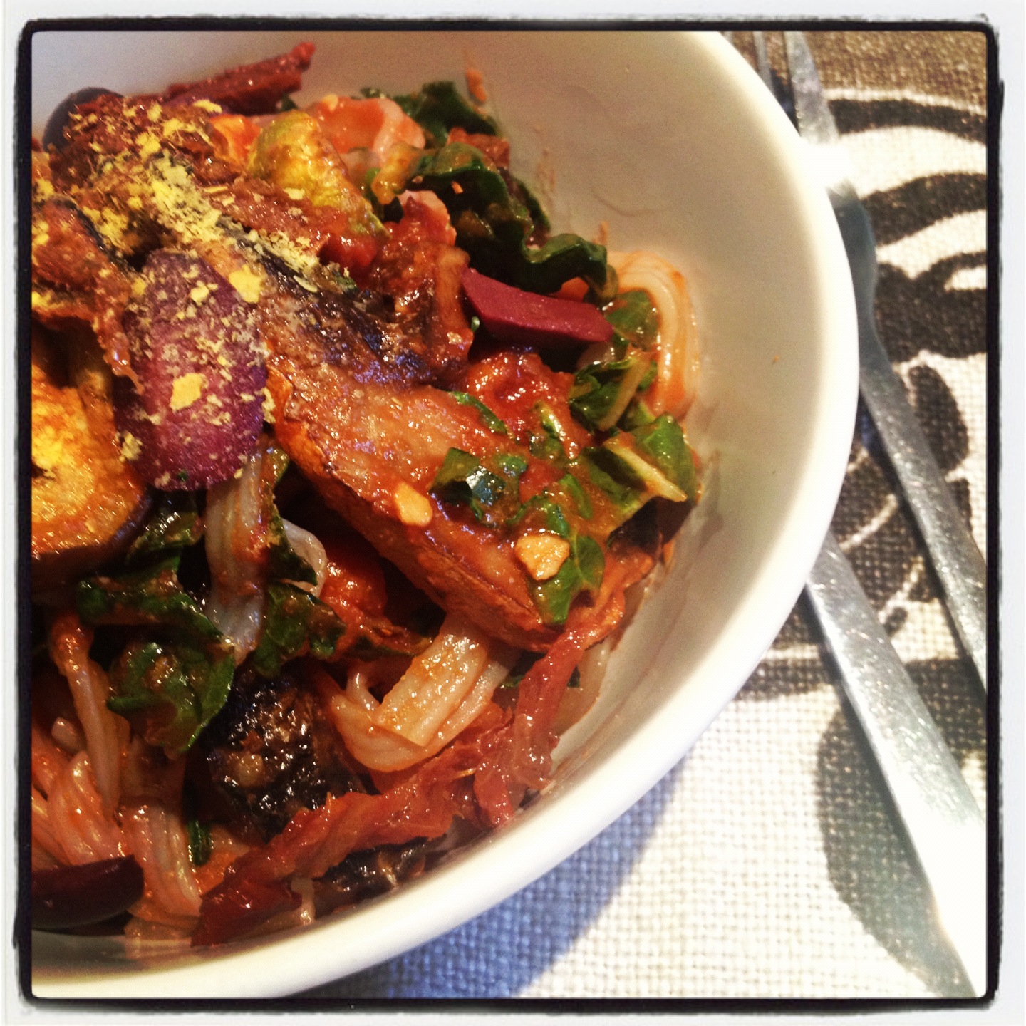 As you can see, I didn't use any oil in the cooking, so this is perfect for those watching their fat intake. The pasta itself only has 11.8 calories per serve, so when you combine it with dry baked vegetables and a tomato sauce, you've got a really good, low-fat, low-calorie, nutrient dense meal. You are getting some B group vitamins from the mushrooms and nutritional yeast, some iron from the spinach, and the vitamin c in the tomato sauce is helping with it's absorption. Winner of a dish. Really satisfying and won't leave you filling bloated and needing a nap like starchy pasta.