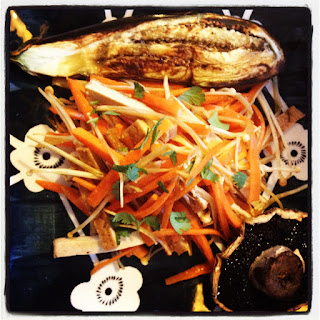 I served it with some grilled baby eggplant and mushrooms which I brushed with some tamari.